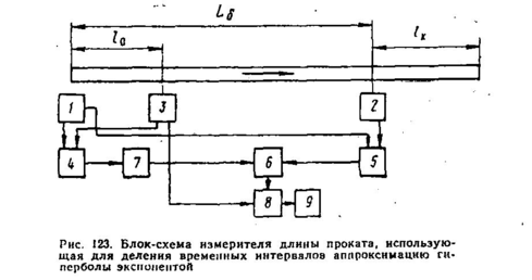 . передается в выходное устройство 9. Данный метод измерения используется, например, для измерения длины горячих труб в пределах 7—8 м на станах печной сварки. Скорость передвижения труб: 3—8 м/с. Ошибка измерения при этом не более
