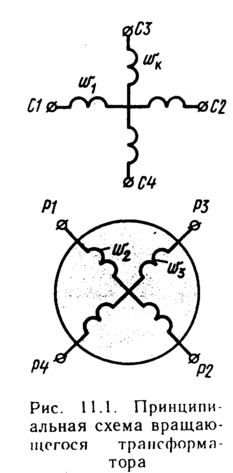 (P1 — P2 и P3 — P4) — на роторе (рис, 11.1). Обмотка возбуждения (C1— C2) включается в сеть переменного тока, компенсационная обмотка C3 — C4 замыкается накоротко или на резистор. Обмотки на роторе называются вторичными: синусной P1—P2 и косинусной P3—P4, электрический контакт с обмотками ротора осуществляется с помощью контактных колец и щеток (аналогично контактным сельсинам) либо посредством спиральных пружин, если BT работает в режиме ограниченного угла поворота. B последнем случае yгoл пoвopoтa poтopa BT oгpaничивaeтcя мaкcимaльным yглoм зaкpyчивaния cпиpaльныx пpyжин.