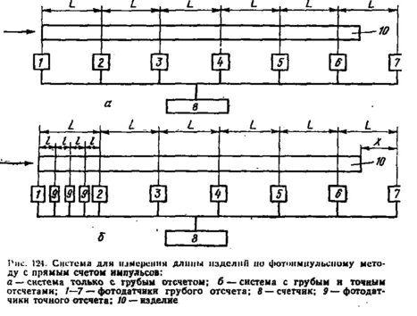 последовательно проходит мимо фотодатчиков 2, 3 и т. д. Импульсы от фотодатчиков поступают в счетчик 8 и суммируются. Каждый импульс соответствует расстоянию L. Таким образом, длина изделия будет равна L (п—1), где п-—число засвеченных фотоэлементов. Счет импульсов прекращается, когда задний конец изделия выйдет из поля зрения фотодатчика 1. Точность измерения таким методом зависит от шага L установки фотодатчиков. Для увеличения точности измерения с одновременным снижением числа фотодатчиков схему измерения строят по принципу грубого и точного отсчётов. В этом случае в отличие- от предыдущего, где отсчет ведется одним концом изделия, а другой дает сигнал об окончании счета, отсчет ведется обоими концами изделия (рис. 124,6). Грубый отсчет ведется по переднему концу изделия, показаний конец изделия не выйдет из поля зрения фотодатчика 1. Точный отсчет изделия ведется по заднему концу изделия с момента выхода заднего конца из поля зрения фотодатчика 1 до момента засветки следующего фотодатчика грубого отсчета (на рис. 124,б это фотодатчик 7). Длина полосы при этом равна