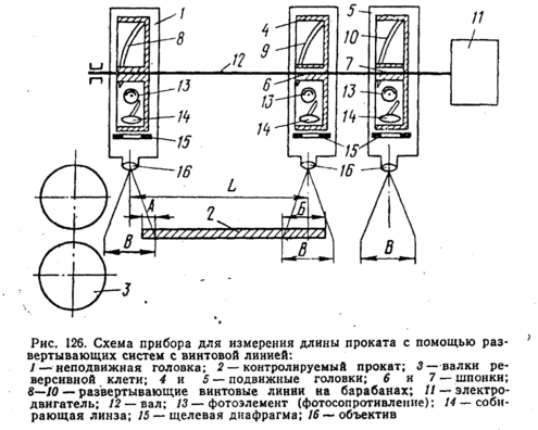 Ha рис., 126 приведена схема прибора для измepeния длины проката с механической развертывающей системой. прибор предназначен для измерения длины проката на реверсивном стане, Ha специальном валу, расположенном вдоль прокатного изделия, устанавливают измерительные головки. число головок равно n+1 (п. – число нечетных проходов, при которых необходим контроль длины проката).·одну из головок 1 устанавливают стационарно непосредственно возле валков реверсивной клети, а другие — подвижные 4 и 5 — на расстоянии от первой, равном номинальному значению контролируемой длины раската. подвижные головки связаны с валом скользящими шпонками 6 и 7. B каждой измерительной головке вмонтирована оптическая система, состоящая из объектива 16 и собирательной линзы 14. объектив проектирует конец проката на щелевую диафрагму 15, которая «вырезает»·из вceгo Поля зрения объектива узкую полоску изображения конца полосы в направлении длины проката на фоне осветителя. осветитель находится внизу под изделием (на рисунке не показан). за диафрагмой расположен барабан с винтовыми прорезями, световой поток, пройдя через диафрагму и винтовую прорезь, собирается линзой 14 и попадает на фотоэлемент 13.
