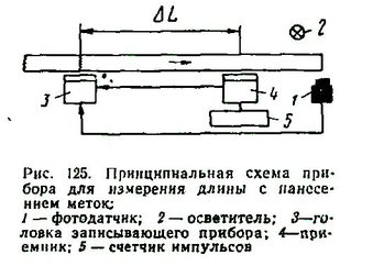 изделиям длины изделий с прямым счетом импульсов относятся и приборы с нанесением магнитных, тепловых, радиоактивных, люминесцентных и других меток. Каждая метка имеет определенную цену длины изделия. При прохождении мимо регистратора эти метки считаются измерительной схемой (рис. 125). При прохождении передним концом фотодатчика 1 подается команда на головку записывающего прибора 8 для нанесения метки в изделие. При дальнейшем движении метка проходит мимо приемника 4, который считает метки и дает команду прибору 3 на нанесение следующей метки.