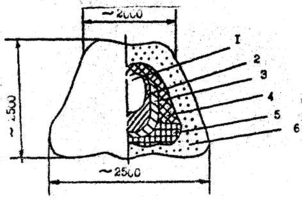 1 - центральная зона; 2 - периферийная зона; 3 - зона монокристаллов; 4 - боковая корка; 5 - нижняя корка; 6 - осыпь (недоплав).