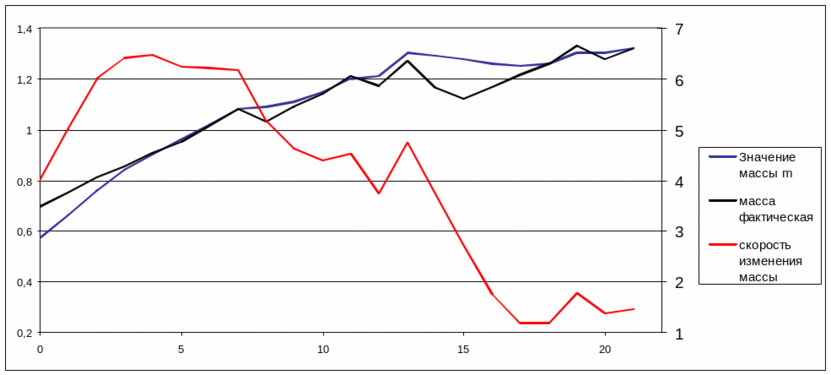 Сравнивая полученные при обработки кривых результаты видно, что использование сложного алгоритма позволяет более точно определять массу дозируемых материалов. Точность определения массы достигается за счет более точной и надежной обработки данных и выделений на весовых кривых локально-стационарного участка, по которому можно судить о действительной величине массы с достаточной объективностью.