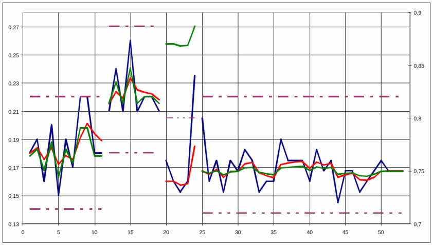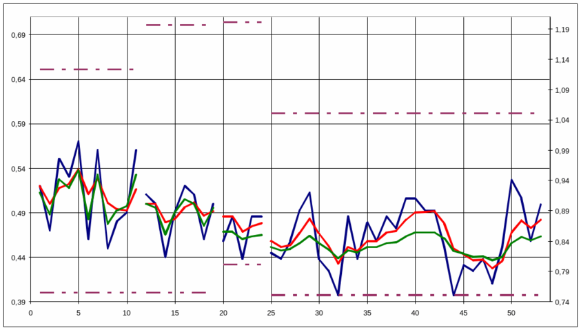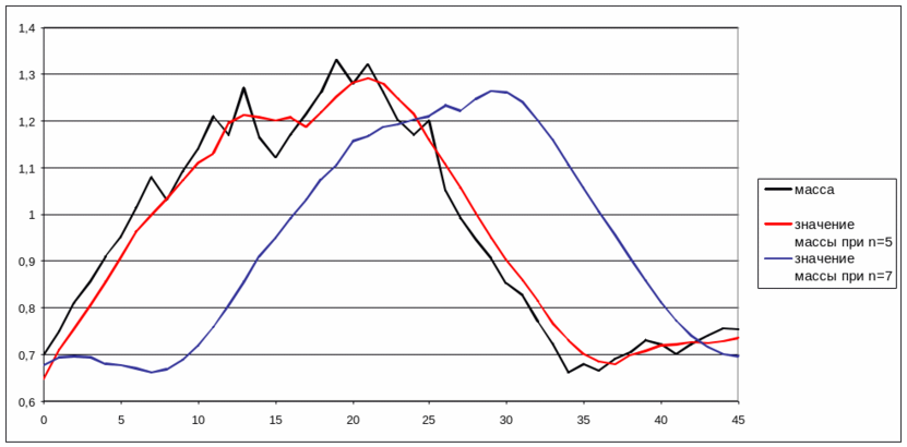 Результаты обработки весовых кривых с использованием алгоритма текущего среднего представлены в таблице 5 и показаны графически на рисунке 7. Результаты обработки при помощи алгоритма робастной фильтрации сведены в таблицу 6 и показаны на рисунке8.