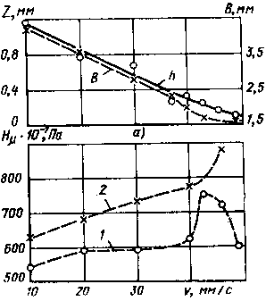 Рис. 1.5. Зависимость глубины, ширины (а) и твёрдости (б) зоны обработки от скорости перемещения луча лазера: