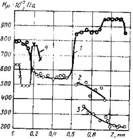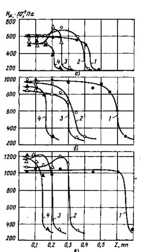 Рис. 1.3. Распределение микротвёрдости по глубине зон обработки непрерывным излучением лазера на СО2 в образцах: