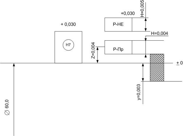 Р-НЕ = Dmax + 0,5Н = 60,030 + 0,0025 = 60,03325 – 0,005 мм