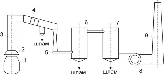 1 – конвертер; 2 – юбка котла-охладителя; 3 – котел-утилизатор; 4 – орошаемый газоход; 5 – труба Вентури; 6 – каплеуловитель №1; 7 - каплеуловитель №2; 8 – нагнетатель; 9 – дымовая труба.