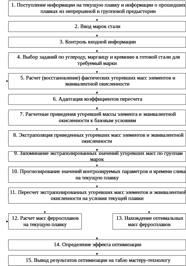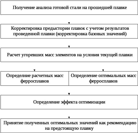 Основная задача легирования – получение каких-то определенных физико-химических свойств стали, а также обеспечение заданного химического состава. Это достигается путем введения необходимых элементов в сталь и растворение их в жидком железе. Но условия сталеплавильного процесса таковы, что часть подаваемых элементов, окислившись, переходят в шлак из-за воздействия с кислородом газовой фазы, оксидом железа шлака, растворенным в металле кислородом. В результате этого не вся масса легирующих переходит в металл. Поэтому для получения заданного химического состава необходимо давать строго определенные массы раскислителей и легирующих, которые должны определяться с учетом угоревших масс, то есть масс, перешедших в шлак. Воздействиями на процесс с точки зрения пользователя в этом случае является отдача тех масс ферросплавов в ковш, которые рекомендуются данным алгоритмом.