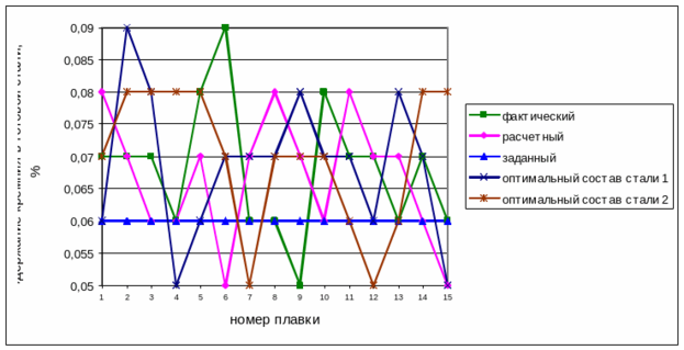 Итоговый анализ показывает, что использование процедуры оптимизации делает расчет масс ферросплавов более гибким, позволяющим учитывать ограничения по наличию ферросплавов, себестоимости стали. При необходимости можно путем изменения коэффициентов ориентировать алгоритм на менее экономичную технологию, но гарантирующую получение высоких механических свойств проката.