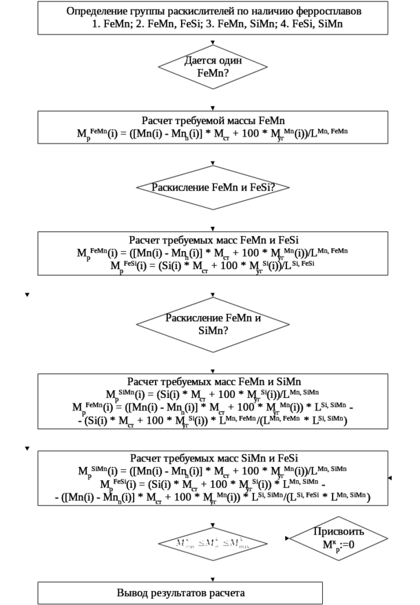 том прогнозируемого угара и процентного содержания элемента в ферросплаве. На тех марках, которые не раскисляются двумя ферросплавами, содержащими один и тот же элемент (FeMn, SiMn; FeSi, SiMn), расчетная масса находится решением системы двух уравнений. Если производится расчет FeMn и SiMn, то сначала рассчитывается SiMn на необходимое количество кремния в готовой стали, а затем – FeMn с учетом марганца в SiMn. Если производится расчет FeSi и SiMn, то сначала рассчитывается SiMn на необходимое количество марганца в готовой стали, а затем рассчитывается FeSi с учетом кремния в SiMn. Рассчитанные массы раскислителей проходят контроль на минимальный диапазон. Блок-схема алгоритма расчета масс ферросплавов представлена на рис.18.