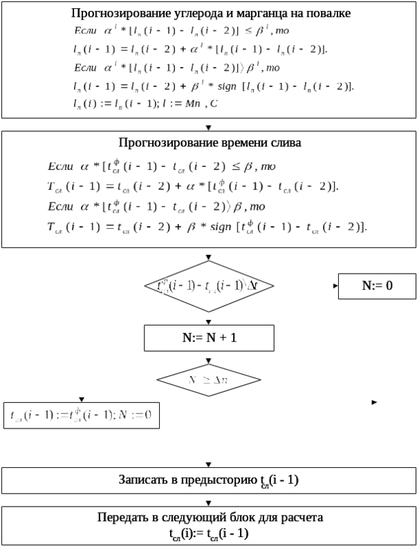 В блоке 10 прогнозируются значения контролируемых параметров и времени слива на текущую плавку. Иногда слив металла в ковш и раскисление происходят до прихода экспресс-анализа, содержание углерода и марганца в стали определяется по скрапине, поэтому для алгоритма расчета ферросплавов содержание углерода и марганца на повалке прогнозируются как