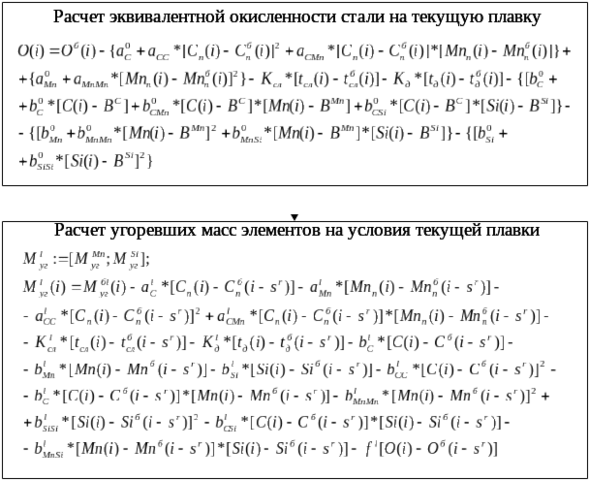 В блоке 11 осуществляется пересчет экстраполированных угревших масс элементов и эквивалентной окисленности на условия текущей плавки. Окисленность плавки О(i) перед раскислением оказывает существенное влияние на угар элементов. Приборов непосредственного контроля окисленности металла пока нет, и окисленность плавки считается по таким косвен-