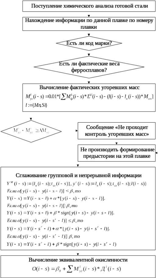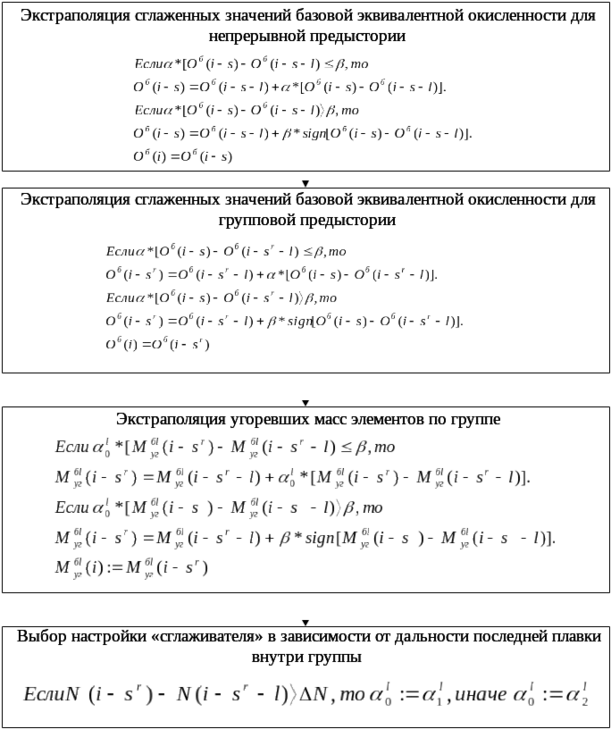 Сглаженные релейно-экспоненциальным фильтром значения базовых угоревших масс элементов прогнозируются на следующие плавки данной группы марок. Блок-схема алгоритма экстраполяции приведенных угоревших масс и эквивалентной окисленности представлена на рис.15.