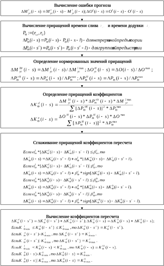 предыдущей ближайшей плавкой, для групповой предыстории – как разность между (i-s)-той плавкой и ближайшей предыдущей плавкой по группе. Ошибки прогноза угоревших масс и эквивалентной окисленности и приращения времени слива и додувки нормируются и по ним рассчитываются приращения коэффициентов. Затем эти приращения сглаиваются релейно-экспоненциальным фильтром, и по сглаженным значениям приращений корректируются спрогнозированные коэффициенты пересчета на (i-s)-той плавке. Эти же коэффициенты заносятся во все последующие бланки по плавкам. Алгоритм адаптации коэффициентов пересчета представлен на рис.13.