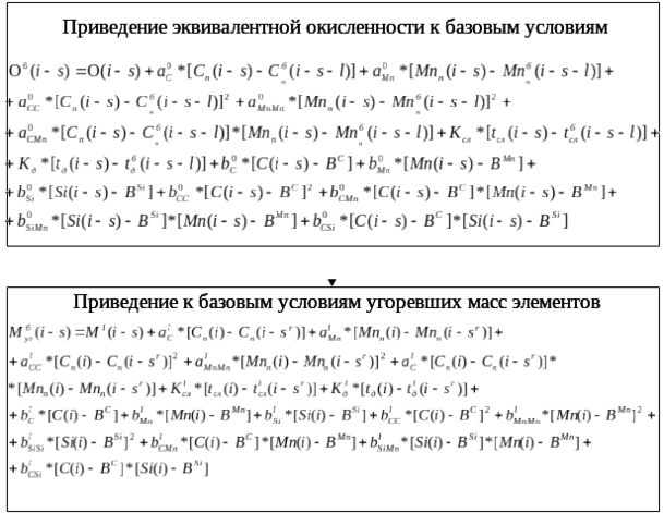 В блоке 8 происходит экстраполяция приведенных угоревших масс элементов и эквивалентной окисленности. Сглаженные релейно-экспоненциальным фильтром значения базовой окисленности прогнозируются на последующие по номерам плавки. Для угоревших масс элементов в зависимости от того, как давно плавилась данная марка стали, выбирается настройка сглаживателя 11 или 12 для каждого элемента. При этом если марка стали через N плавок, то настройка сглаживателя берется равной 12.