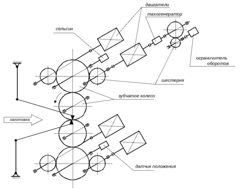 Привод как универсальных, так и горизонтальных клетей осуществляется от одного электродвигателя через двухскоростной комбинированный редуктор.