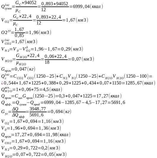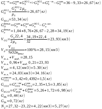 Отходящие газы приняли окончательный вид: SO2 ~ 53,83%, CO2 ~ 7,35%, N2 ~ 12,74%. Необходимо заметить то, что объем требуемого дуться на сжигание 0,694 кг топлива составил 1,36 нм3.