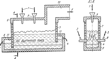 1 — шихта; 2 — дутье; 3 — штейн; 4 — шлак; 5 — газы; 6 — кладка печи; 7 — медные литые кессоны; 8 — фурмы; 9 загрузочная воронка; 10 — аптейк; 11 — штейновый сифон; 12 шлаковый сифон