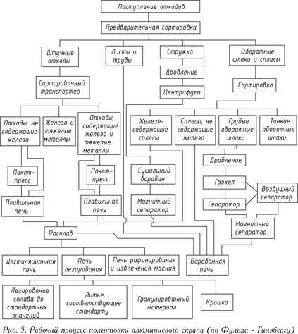 Безупречное приготовление алюминиевого скрапа в самых разнообразных пропорциях можно осуществлять только на специально оборудованных плавильных заводах. Представление о сложном рабочем процессе на таком заводе дает рис. 5.