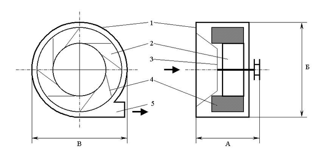 Центробежный вентилятор среднего давления Ц4 – 70 №12 приведён на рис. 13. Он состоит из цилиндрического корпуса 1, внутри которого находится вращающееся рабочее колесо 2. На рабочем колесе закреплены лопатки 3, угол поворота которых может изменяться, в результате чего меняется производительность вентилятора. Засасываемый воздух проходит через коллектор 4, и далее через лопатки рабочего колеса направляется в короб воздуховода 5, из которого поступает в воздухонагреватель.