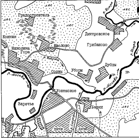При подъезде к большому подмосковному селу Успенскому открывается вид на долину реки Москвы. За рекой возвышается затейливо украшенная ярусная церковь. Это церковь Спаса нерукотворного образа в селе Уборы - одно из лучших творений крепостного архитектора Якова Бухвостова, храм в стиле так называемого "нарышкинского барокко" [Шватченко, 1994]. Церковь стоит близ уступа одной из речных террас, не слишком высоко, но, тем не менее, господствует надо всей округой, видна отовсюду и неизменно приковывает внимание проезжающих по Успенскому или Никологорскому шоссе. Чуть левее церкви на холме, именуемом Николиной горой, темнеет величественный сосновый бор. Эти река, гора и бор подарили названия расположенным в бору дачным посёлкам Заречье и Николина Гора, а также санаторному посёлку Сосны. Посёлки слились и давно образуют одно целое. Раскинувшиеся у бора Уборы по названию созвучны с бором, но это лишь совпадение. Река Москва отделяет Уборы и Заречье от старинного села Успенского, с которого мы и начали рассказ. Вот эти поселения с их интересной историей и архитектурными памятниками, с окружающей природой - живописными реками и лугами, уникальными лесами и болотами - и являются предметом данной книги. Вкратце упомянем и соседние сёла - Иславское, Аксиньино, Дмитровское, а также деревни - Масловку, Грибаново, Дубцы... Но начнём не с них, а с рек - "души" этого удивительного подмосковного уголка.