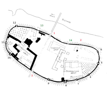 13 - Тайничные водяные ворота, 14 - Боярские водяные ворота.
