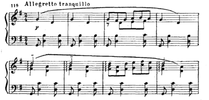“Листок из альбома” соединяет непосредственность лирического чувства с изяществом, “галантностью” альбом­ного стихотворения. В безыскусной мелодии этой пьесы слышны интонации народной песни. Но легкая, воздушная орнаментика сообщает изысканность этой простой мелодии. Последующие циклы “Лирических пьес” привносят новые образы и новые художественные средства. “Колыбельная” из второй тетради “Лирических пьес” звучит как драматическая сценка. Ровная, спокойная мелодия складывается из вариантов простой попевки, словно выросшей из мерного движения, покачивания. С каждым новым проведением ее усиливается ощущение покоя, света: