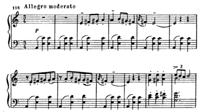 Ярким своеобразием отличается “Вальс”. На фоне ти­пично вальсовой фигуры сопровождения выступает изящная и хрупкая мелодия с острыми ритмическими очертаниями. “Капризные” переменные акценты, триоли на сильной доле такта, воспроизводящие ритмическую фигуру спрингданса, вносят в вальс своеобразный колорит норвежской музыки. Он усиливается характерной для норвежской народной му­зыки ладовой окраской (мелодический минор):