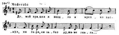 До и после самой песни звучит чудесный наигрыш. Близ­кий по характеру к протяжным и задумчивым наигрышам рожка, он тем яснее “вписывается” в воображаемый пейзаж, что его последняя, квартовая интонация отдается двукратным эхом. Самая песня, простая по интонационному строению (поступенное движение мелодии и ходы по трезвучиям, свой­ственные норвежской музыке), плавная (ровность и едино­образие ритмических фигур, равномерность аккордов сопро­вождения) звучит скромно, сдержанно и величаво. С каждой новой фразой растет проникновенность мелодии: сперва за счет большего напряжения гармоний, дальше—за счет обострения выразительности отдель­ных интонаций. Эта значительность, проникновенность каж­дой интонации распространяется даже на обычный, казалось бы, каденционный оборот мелодии в конце ее (ритмическое “удлинение” заключительных интонаций).