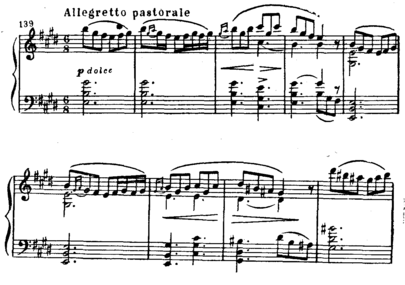 В пьесе “Утро” яркая красочная живопись природы со­единяется с тонким лиризмом. Пьеса строится на вариантном развитии одной пентатонной мелодии. Звучащая вначале поочередно у флейты и гобоя, она воспринимается как пере­кличка наигрышей свирели и рожка. Это создает ощущение широкого пространства, воздуха.