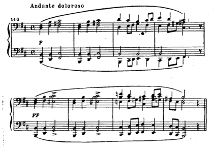 “Смерть Осе” — произведение огромной драматиче­ской силы. Лаконизм Грига достигает здесь, кажется, пре­дела. Как бы на одном дыхании композитор ведет начальный сосредоточенный, суровый образ к огромному напряжению, драматической кульминации. И от нее—к светлым и скорб­ным звучаниям. Лаконичный музыкальный образ, на развитии которого строится пьеса, сочетает мерную поступь марша со стро­гостью хорала и скорбными песенными интонациями. При повторе его во втором предложении периода напряжение усиливается благодаря обострению гармонии и иной динамической окраске. Повторы периода при постепенном усилении звучности, уве­личении “объема звучания” и тональных контрастах — вот средства, какими достигается напря­жение, динамика первой части двухчастной формы.