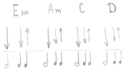 Итак, после того, как Вы ознакомились с таблицей длительностей, можно вернуться к бою песни группы Кино “Пачка сигарет”. Обычно эта песня всегда появляется самой первой в репертуаре начинающего гитариста, т.к. она состоит всего из четырех аккордов, которые можно освоить достаточно быстро, и бой этой песни очень прост. Ниже приведены аккорды (самая верхняя строчка изображения), далее – стрелками обозначены удары руки по струнам (стрелка вниз – удар сверху вниз, вверх – с низу вверх);Удар можно делать только указательным пальцем, или несколькими пальцами(кому как удобно).При желании, играть можно даже медиатором. Под стрелками находятся длительности нот, обозначающие частоту ударов. Для начала мы советуем отработать отдельно бой и отдельно зажимать аккорды, а потом попробовать все это объединить. При желании, Вы можете скачать аудио файл с гитарной записью композиции «Пачка сигарет».(только гитарный аккомпанемент)