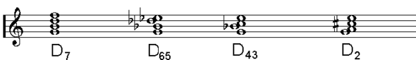 Обращение можно получить, перенеся нижний звук аккорда на октаву вверх. Собственно, необязательно на одну октаву. Главное, чтобы нижним звуком стал другой тон аккорда. Названия обращений септаккорда образуются от двух интервалов: между нижним звуком и примой аккорда, и между нижним звуком и септимой аккорда.