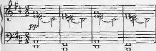 В создании музыкального образа важная роль принадлежит гармонии — перемежающиеся трезвучия (ре — фа-диез — ля и си — ре — фа-диез), усложненные дополнительными, диссонирующими звуками, отличаются особой затененностью; каждый аккорд звучит как бы в дымке.