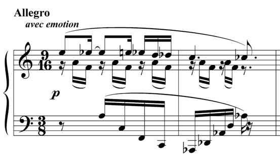 Начинается главная партия (такт 39, Allegro) – образец типичного скрябинских полетно – стремительных тем, олицетворяющим порыв, восторженность, трепетность:
