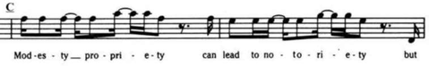 Он создаёт форму с помощью ритма, создавая контраст с помощью фразировки «ап-даун». Суть её в том, что фразы части А начинаются со слабой доли, а фразы части В с сильной. Кроме того фразы части В построены по принципу «вопрос-ответ (?-!)».