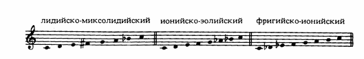 В музыке Бартока усложняется система диатонических семиступенных ладов. Усложнение происходит на основе различного рода комбинирования ладовых форм. Новые формы семиступенных ладов возникают на основе комбинирования тетрахордов по принципу последовательного их соединения и одновременного их наложения. В первом случае создаются ладовые гибриды, что находит отражение в двойном названии: лидийско-миксолидийский, лидийско-эолийский, фригийско-ионийский - наиболее устойчивые разновидности. (Схема см. Приложение №12)