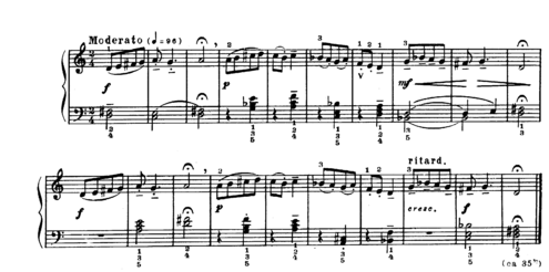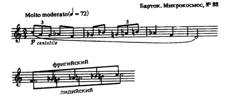 В пьесе №88 "Флейтовый наигрыш" из цикла "Микрокосмос" усложнение звукоряда происходит на основе наложения диатонических тетрахордов (пентахордов) с общим основным тоном: хроматический звукоряд верхнего голоса вырастает из слияния двух диатонических пентахордов от F - фригийского и лидийского. Барток определил этот вид как "диатонику, сжатую в хроматику". Вот что говорит композитор в своих лекциях о природе возникающей у него хроматики: " Подобно тому, как два типа минорной гаммы могут быть использованы одновременно, одновременно могут быть использованы и два различных лада... В следующем примере [прим. - Барток имеет в виду пьесу "Флейтовый наигрыш"] в результате наложения лидийского и фригийского пентахордов с общим тоном образуется диатонический, наполненный бемольными и диезными ступенями звукоряд. Эти хроматические ступени выполняют другую функцию по сравнению с альтерированными ступенями… Бемольные и диезные тоны являются диатоническими компонентами диатонической модальной шкалы, что можно увидеть на примере №88 "Флейтовый наигрыш" из цикла "Микрокосмос". (Схема и пример см. Приложение №14)
