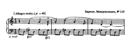 Новые структурные варианты диатонических ладов в современной музыке связаны с их индивидуально-стилевой трактовкой, при которой возрастает число "именных" ладов. Своеобразие последних проявляется в добавлении специфических высоких или низких ступеней. Так, характерной выразительностью обладает лад Бартока - натуральный минор с высокими IV и VI ступенями. Композитор использует его в пьесе № 113 "Болгарский ритм" из цикла "Микрокосмос". (Схема и пример см. Приложение №15)