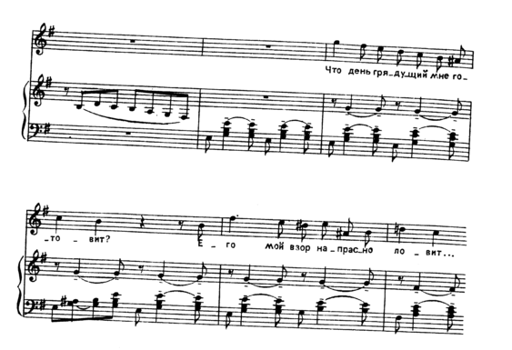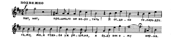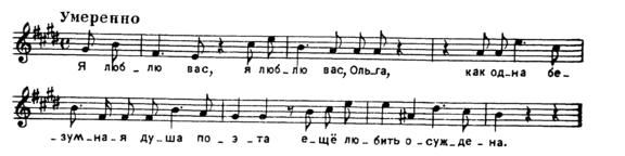 По-иному обрисован Онегин. Уже в первых тактах вступления к его арии проступают черты человека учтивого, светского, умеющего владеть собой. Мелодия арии развёртывается неторопливо, в спокойном, размеренном ритме.