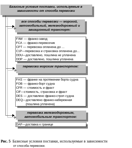 При определении таможенной стоимости необходимо учесть базисные условия поставки, которые используются в зависимости от способа перевозки товара и иных предметов. Они представлены на рис. 5.
