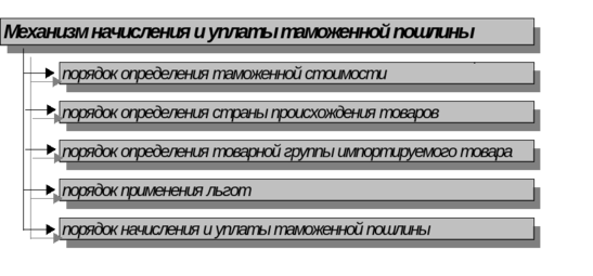 бъектом обложения является таможенная стоимость или физическая единица импортируемых товаров или других предметов (рис.2), которые перемещаются через таможенную границу Украины. Для определения таможенной стоимости товаров валюта контракта пересчитывается в национальную валюту Украины по курсу Национального банка Украины, который действует на дату подачи таможенной декларации.Механизм начисления и уплаты таможенной пошлины включает в себя несколько элементов, таких как порядок определения контрактной стоимости товара, порядок определения страны происхождения товара, порядок определения товарной группы импортируемого товара, порядок применения льгот, если таковые предусмотрены для данного товара, порядок начисления и уплаты таможенной пошлины (рис.3).