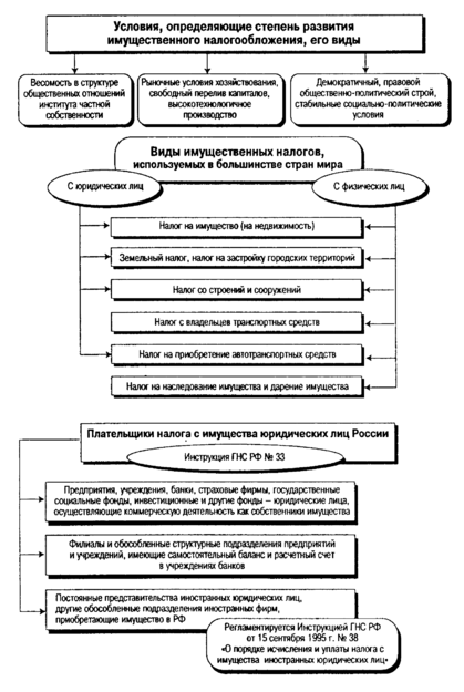 В целом налогообложение имущества в России и за рубежом имеет более или менее схожие основные принципы, кроме одного существенного отличия. Это отличие заключается в том, что в России не существует отдельного налога на недвижимость, который охватывал бы обложение главных видов недвижимого имущества – строений и земли (рис. 2). Налогообложение земли выделено в отдельный земельный налог, а обложение строений регулируется законами о налоге на имущество предприятий и физических лиц.