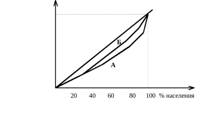 Линия А отображает неравенство в распределении доходов до уплаты налогов. Линия Б показывает, что прогрессивные налоги приводят к более равномерному распределению доходов, остающихся после уплаты налогов. Влияние их представлено на рисунке, естественно, в преувеличенном виде, чтобы лучше выявить суть вопроса.