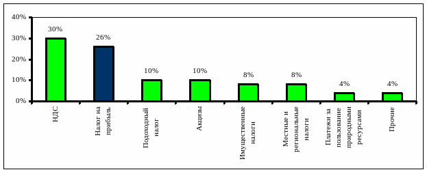Налог на прибыль предприятий служит инструментом перераспределения национального дохода и является одним из главных доходных источников федерального бюджета, а также региональных и местных бюджетов. Если рассматривать структуру доходов бюджета российской федерации, то будет видно, что доля налога на прибыль уступает по величине лишь доле налога на добавленную стоимость (см.рис.1). [7. 42]