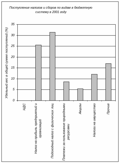 Распределение общего объема поступлений в бюджеты территорий Российской Федерации по видам налогов в 2001 году