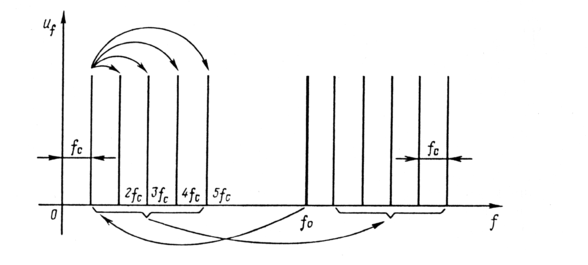 Как формируется требуемое множество частот? Синтез требуемого множества колебаний, образующих сетку частот, осуществляется следующим образом. Вначале производится деление частоты fо и формируются колебания частоты fc. На оси частот это колебание показано компонентой fc, отстоящей от начала отсчета на интервал fc. Далее путем умножения формируются колебания частот 2fc, 3fc ..., nfc. Наконец, производя преобразование частоты, можно осуществить перенос сетки частот fc, 2fc, ..., nfc на интервал f0 и размещение ее справа от частоты f0. В итоге получаем требуемое множество частот
