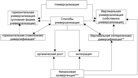 Выделены два типа универсализации: вертикальный и горизонтальный и соответственно этому принципу выделяем два типа диверсификации: вертикальный и горизонтальный, которые и раскрывают направленность универсализации. Горизонтальный тип универсализации основан на горизонтальном типе диверсификации, означающем диверсификацию деятельности внутри однородных (гомогенных) сфер, то есть традиционной депозитно-кредитной и расчетно-платежной деятельности банков. Вертикальная диверсификация означает расширение деятельности банков за пределы их традиционной сферы, то есть расширение структуры в сторону разнородных (гетерогенных) сфер деятельности. Однако диверсификация не дает ответа на вопрос о том, какими способами происходит консолидация (объединение) новых видов деятельности в универсальном банке.