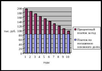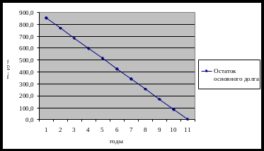 | Года | Остаток основного долга | Процентный платеж за год | Платеж по погашению основного долга | Общий платеж за год |